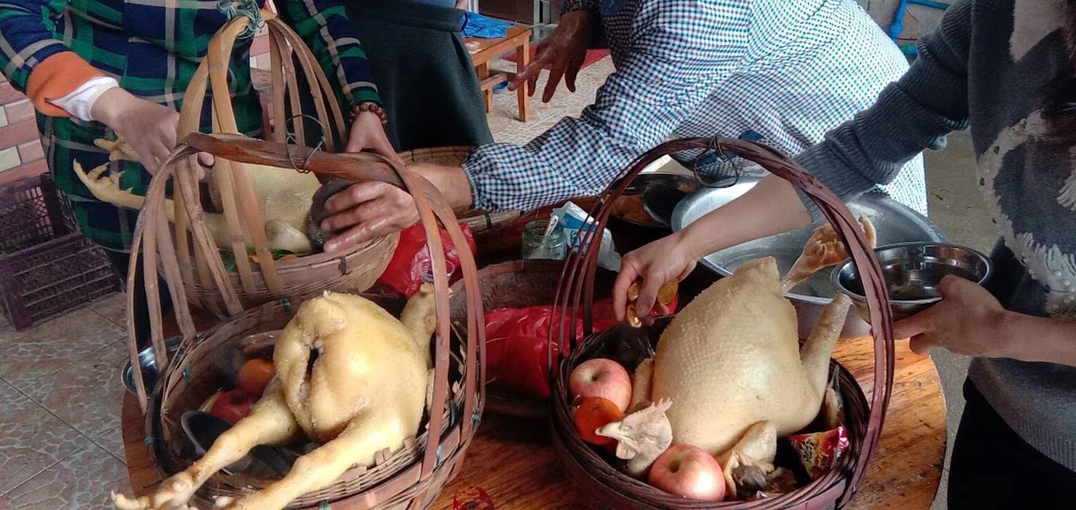 2019.2.3 英德市沙口镇新建 三只鸡及瓜果准备拜神啦