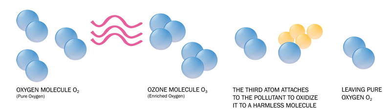 The third oxygen atom of ozone is unstable and extremely reactive. It readily attaches itself to other odor molecules. In so doing, that extra atom of oxygen is consumed with the odor, bacteria gone. Only oxygen is left. Ozone reverts back to oxygen after it is used.