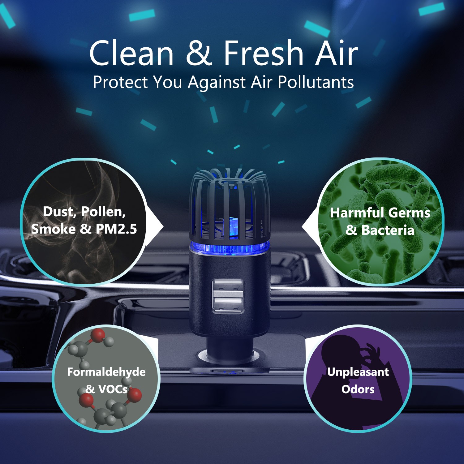 This car air purifier effectively protects you from various types of allergens and airborne pollutants such as dust, pollen, smoke, PM2.5, bacteria, and help reduce bad odors, VOCs.