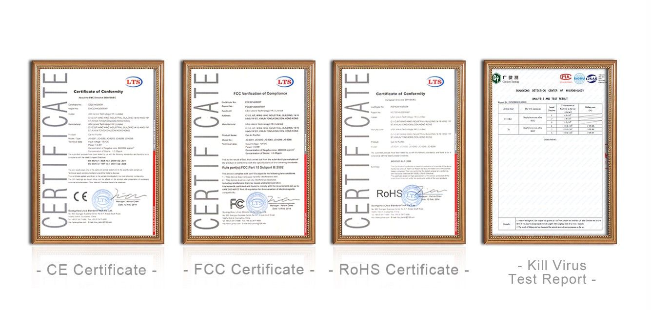Ionkini Car Air Purifier JO-6272 has been CE, RoHS, Fcc certified.