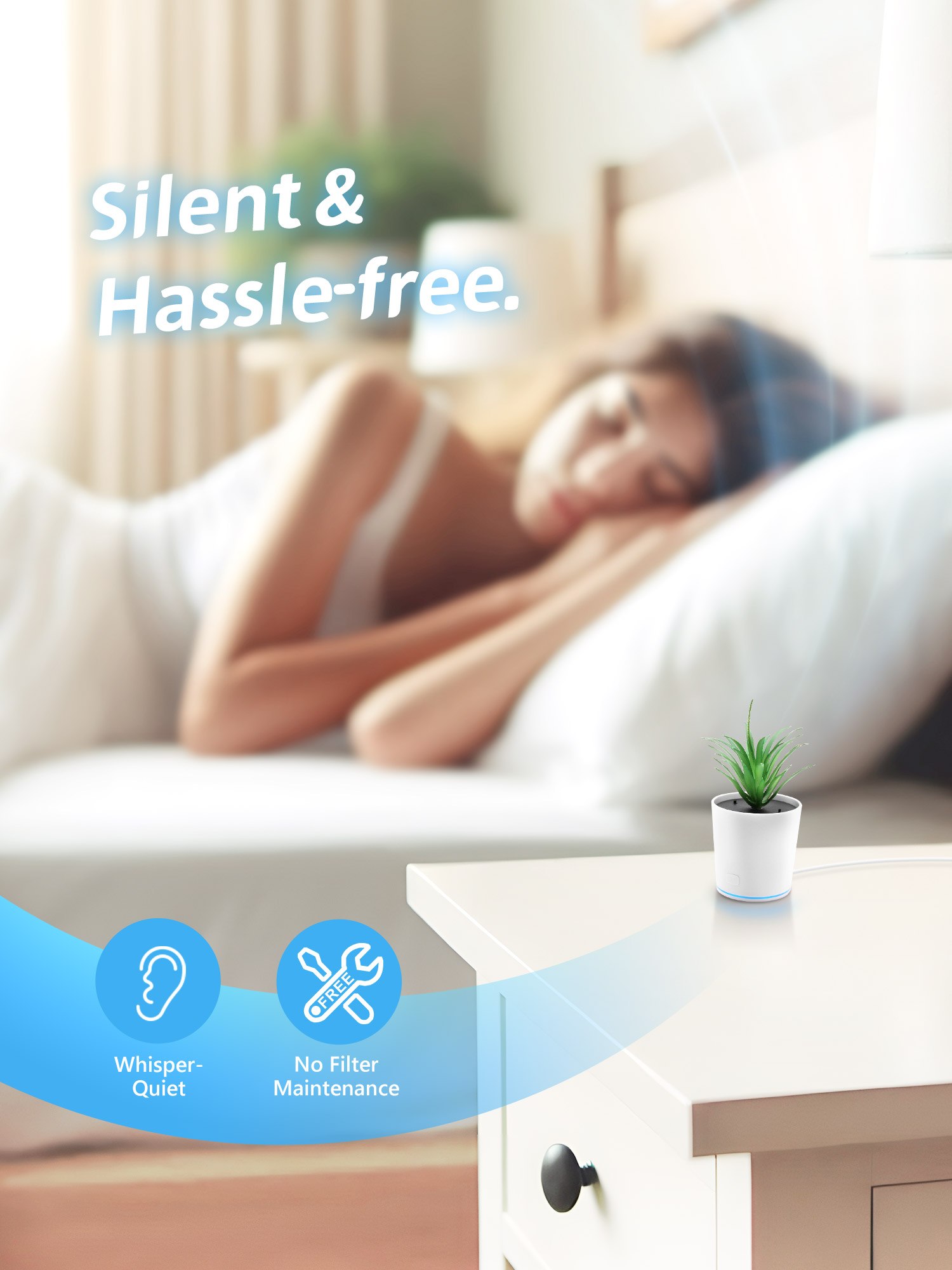 Whisper-quiet operation with no filters to replace.