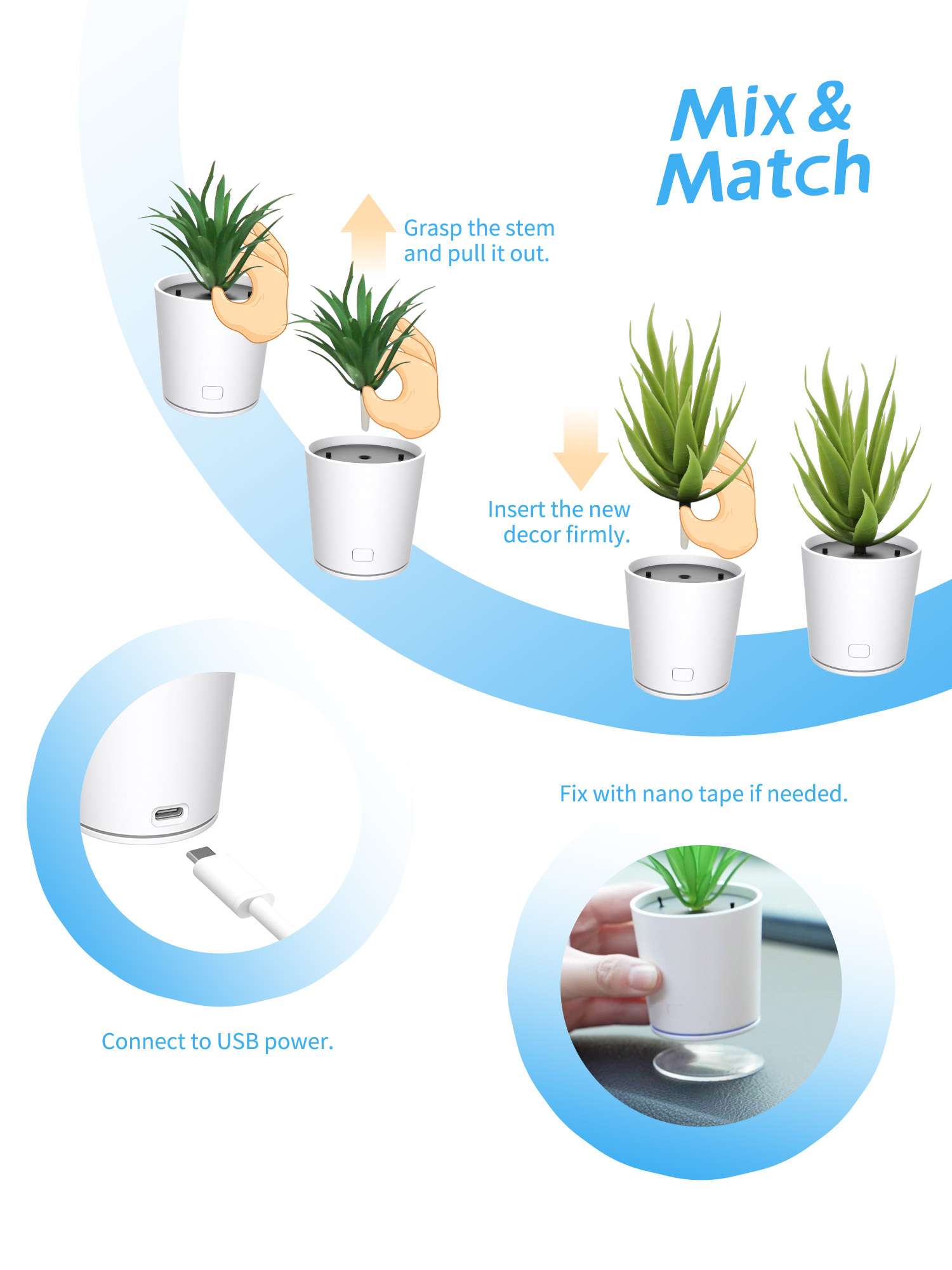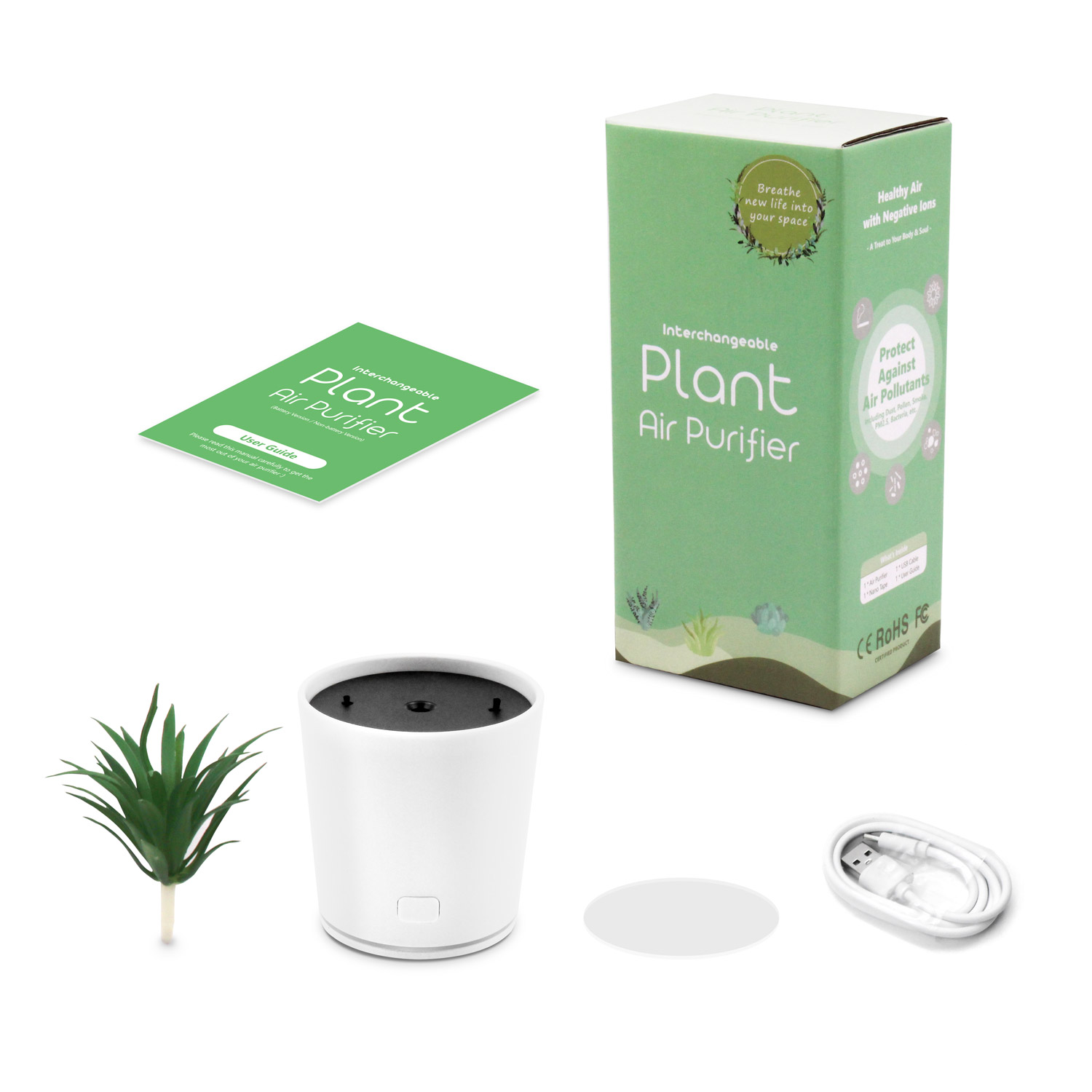 Ornament, air purifier main unit (plant pot), nano tape, USB cable, user guide