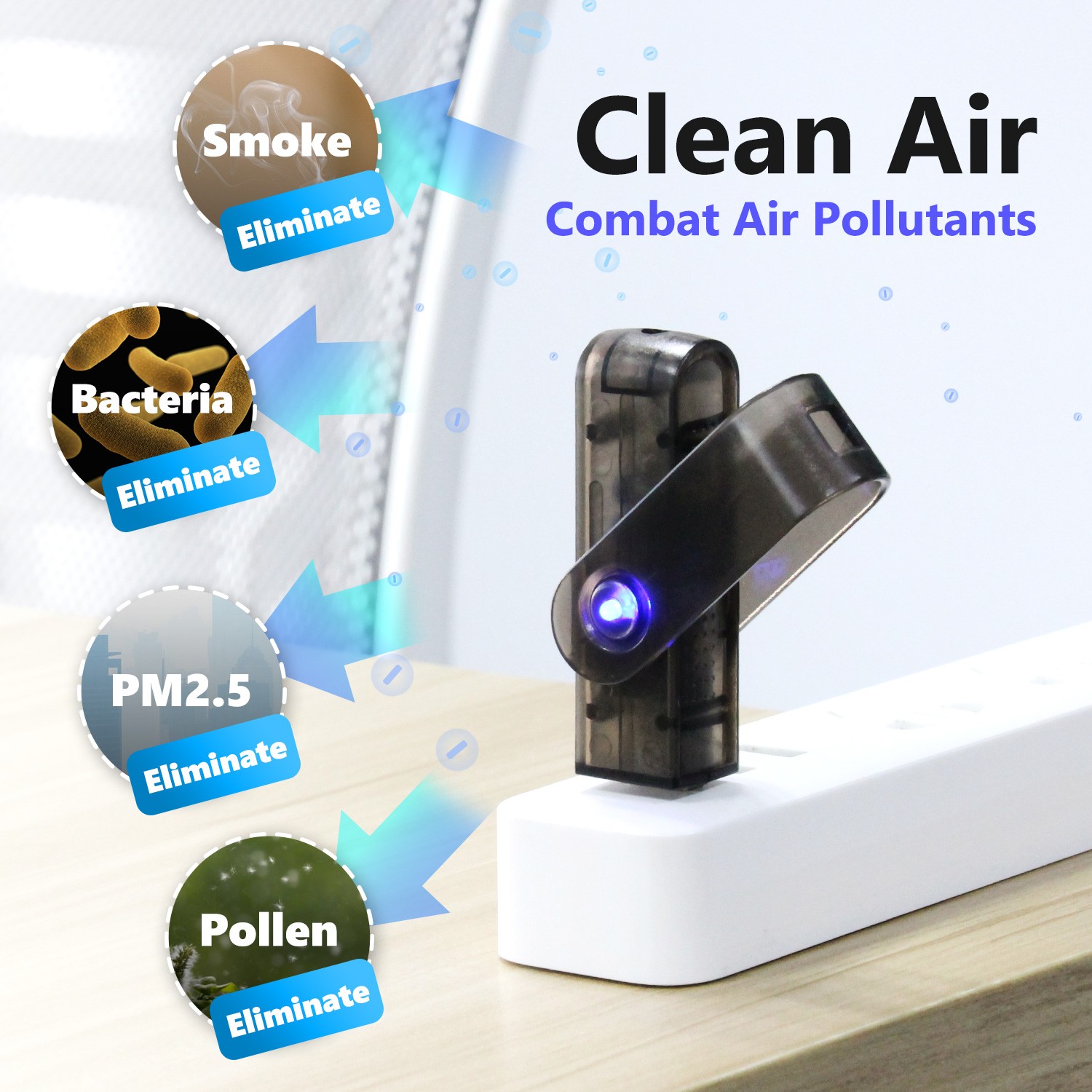 While you work, study or chill, this USB Air Purifier releases high density negative ions, kills bacteria, and effectively removes PM2.5, smoke, and so on.